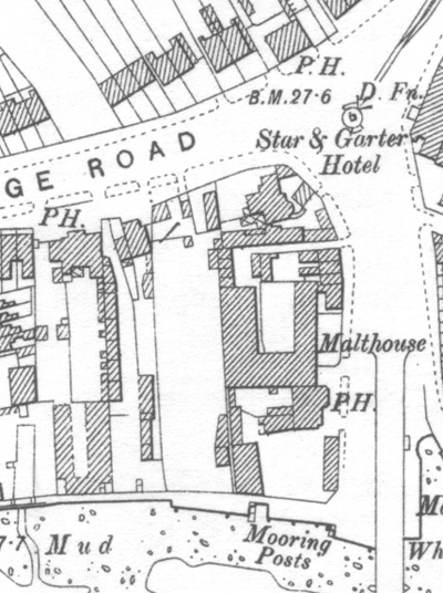 There are three public houses marked PH on the map. The PH nearest to the river was opened in 1839 as Poplar Inn but changed its name in 1867 to the Oxford and Cambridge Hotel. It was owned by the Royal Brewery and bottle tops and bottles with those markings were found when the site was excavated in 2007. The PH on Kew Bridge Road is the Waggon & Horses, a major coaching inn when the road was the main route to the west out of London, first recorded in 1759. In 1840 it was rebuilt larger and slightly back from the road. That building was demolished and rebuilt in 1937/38. It is now due for demolition once more. Next to the Waggon & Horses towards the bridge is The Plough, a beer house first recorded in 1853. It was damaged on 16 November 1940 by German bombing, extended after the war and finally demolished in 2000. Its pub sign is still on the site. The PH on the other side of Kew Bridge Road is the Express Tavern which was open by the 1860s and is still in use as a pub today. Opposite that is the Star & Garter Hotel, another 18th century coaching inn converted to offices and partly rebuilt in 1984. When the second Kew Bridge was opened on 22 September 1789 a celebration dinner was held at the Star & Garter. The hotel stabled visiting horses on the Kew Bridge site behind Layton's house. That narrow alley became known as Star Yard and small houses were built there towards the end of the century.