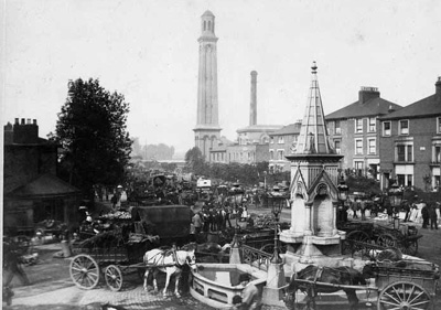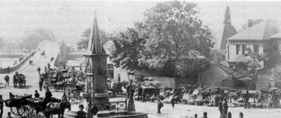 ![]() Another view of the fountain showing the horse troughs taken in 1892 looking west along Kew Bridge Road. |
