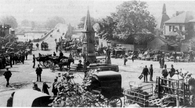 This image also shows the drinking fountain installed in 1877 and the informal market which occupied this junction from 1888. The market was moved to land on the opposite side of Kew Bridge Road in 1893. The market moved into a building in 1906 expanded again in 1921. In 1974 it transferred to Southall and the fountain went with it. It is still on that land which is owned by Western International Market. |
