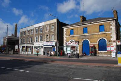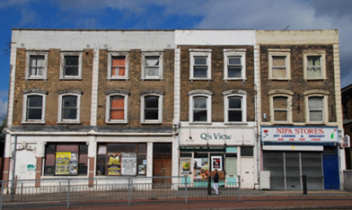 | Next to Kew Bridge Station is the short parade of Victorian shops and flats 57-60 Kew Bridge Road. Sadly neglected with a builder's yard and rented storage units behind a large hoarding was recently removed from the front after planning permission was refused. An appeal for its reinstatement is currently being considered. | Planning applications for conversion of part of this unit to residential flats were turned down in 2004, though in 1999 plans were passed, and the future of these locally listed buildings is uncertain. Q's View was a cafe, so named because it faced the 'Q' Theatre on the opposite side of the road. The theatre closed in 1956 and Rivers House now stands on the site. |