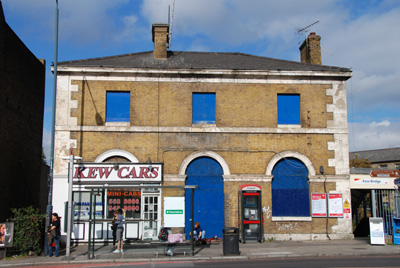 The station building is largely unoccupied - apart from Kew Cars which rents an office at the front - and is not needed by the railway. The entrance to the unmanned platforms and the automatic ticket machines is to the right. The building is listed Grade II and is on the English Heritage register of Buildings at Risk. It is weatherproof and will probably be sold. |