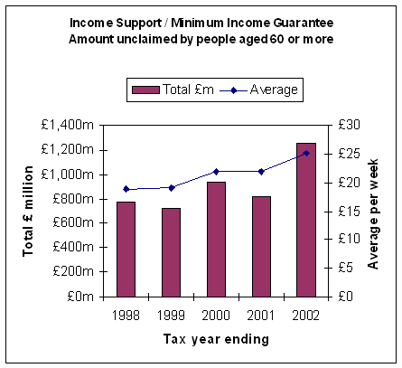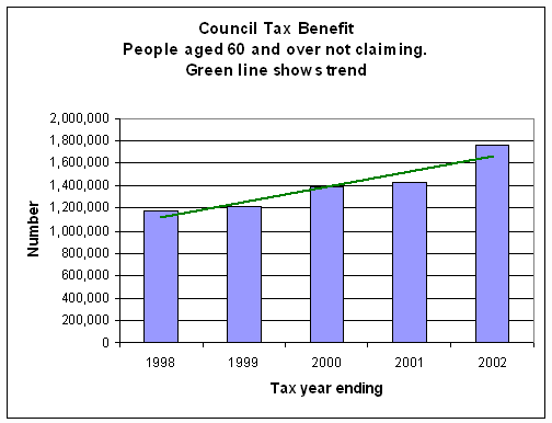 Take income support. In 1997/98 730,000 people over 60 did not claim the extra help they needed, losing an average £18.80 week each. In 2001/02 that had grown by a fifth to 870,000 and they lost £25.10 a week each, leaving £1.26 billion unclaimed. Although the numbers claiming did not rise every year, the trend, shown by the green line on the graph, is upwards.