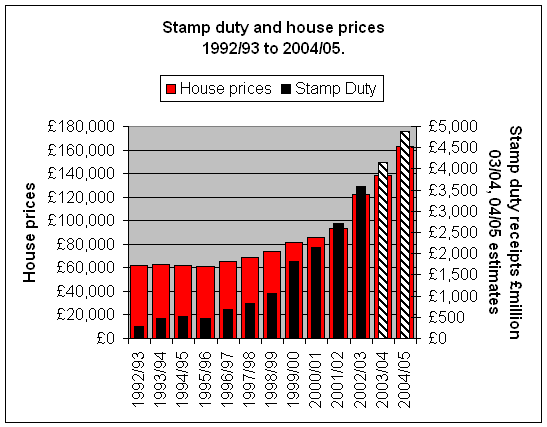 Since Labour came to power, Stamp Duty Land Tax has become a major source of income for the Government. In 1996/97 it brought in just £675mn. But that rose to £3.6 billion in 2002/03, the latest year for which figures are published. With house prices still rising strongly, the take could reach nearly £5 billion this year.