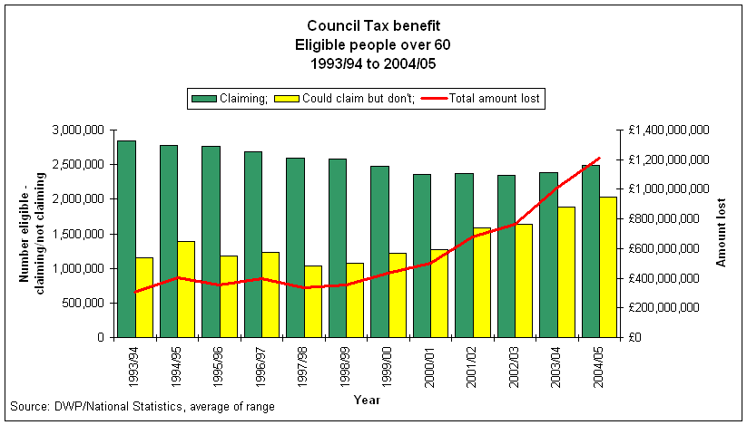 In that year, 1993/94, seven out of ten who were eligible for help with their council tax claimed it. But by 2004/05 that had fallen to barely half. As the yellow bars on the graph show, every year from 1997/98 the number who could claim but don’t has grown. In 1993/94 the total amount lost by them was £305 million. That latest figures show that the money lost has almost quadrupled to £1,210 million.