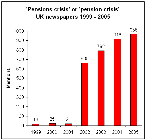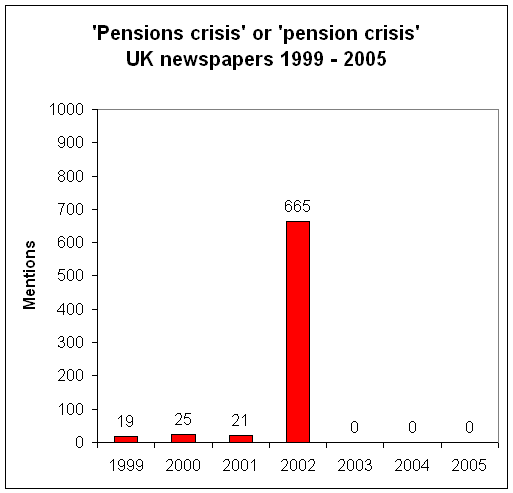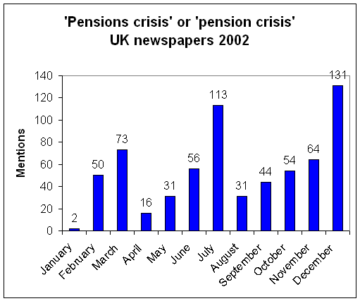 Rather less poetically, I can reveal today that the pensions crisis began on 8 February 2002. Here are the figures. In January 2002 just 2 mentions then in February it shot up to 50.