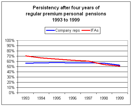 And looking at the change over time, regular premium pensions only this time. It is getting worse. This is persistency after four years of regular premium personal pensions – down from almost 57% to 53% for company reps. And down from more than 70% to barely above half for IFAs. There is no longer term product than a pension. And nearly half are abandoned after four years.