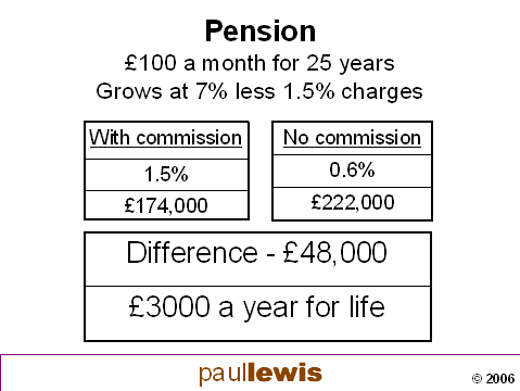 Your client pays £100 a month into a pension. Over 25 years let’s say it grows at 7% a year reduced by 1.5% for charges. That would build up to a fund of £174,000 at the end of that period. If you sell it without commission, ie you take a fee for your advice, those charges could be reduced to 0.6% a year. That means the fund will be £222,000. Which is £48,000 more for your client. Which could mean another £3000 a year for life on the annuity they you buy.