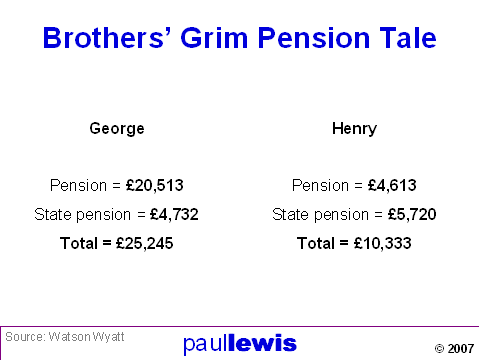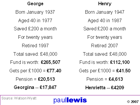 His brother Henry was born ten years later, in January 1947. When he was thirty he didn’t follow his brother’s lead, he thought can’t afford it, kids, house, etc. But when he reached 40 he had his Pearl moment as well and started putting the same £200 a month into the same pension fund as his brother. This year 2007 Henry reached 60. He had also put £48,000 into his fund over the same time – 20 years. But his fund was less than half as much as George’s – just £112,100. The insurance company blamed falling investment returns. And when he came to convert it into a pension he only got a pension of £41.50 for each £1000 in his pot. The annuity provider blamed growing longevity.