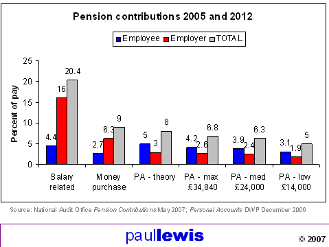 Like so many Government claims that claim of 8% is true but misleading. No-one will pay 8% into the personal account. It is 8% of a band of earnings which, on this year’s figures, runs from £5225 to £34,840. And the most that can be paid in for someone on £34,840 is 6.8%. For someone on average earnings about £24,000 it’s 6.3%. And for someone on low earnings, say £14,000 its 5%. Split between employer and employee. So the most the employer will have to pay is 2.6% but they’ll get tax relief on that so it will cost them either 2% or 1.8% depending on their corporation tax rate. And phased in over three years.