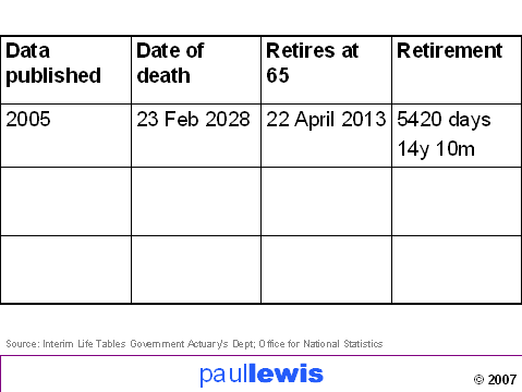 Last year, using tables published the previous November my expected date of death was 23 February 2028. Half the people of my age in the UK will die before that age and half after. If I retire at 65 that gives me 14 years ten months of retirement. But then on Tuesday 21 November I checked the new tables. And now the break even bet was that I will die not on 28 February but on 7 June.