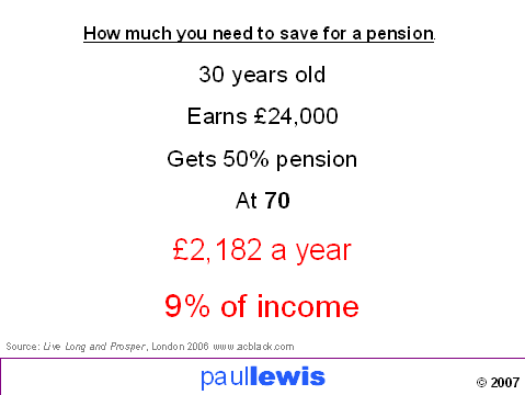 He or she needs to save £2182 a year, just 9% of income. And if that can be shared between employer and employee – not a luxury self-employed people like me have but most do – then 6% from the boss and 3% from me sounds about right. Or if it’s a personal account 3% from the boss and 6% from me.