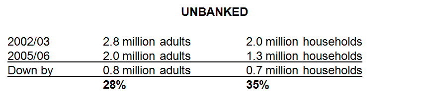 The latest Government figures for 2005/06 show that the number of completely unbanked people – those without a bank account of any sort – was 2 million adults in 1.3 million households. That was down on previous figures – a fall of 28% or 800,000 adults who had gained access to a bank account and 35% of households. That reduction was due partly to Government pressure on banks to introduce basic bank accounts. They are now provided by 17 providers – 14 banks and 3 building societies. All allow direct debits and all provide a cash card to withdraw money from an ATM. But only 6 provide a debit card to pay from the account by plastic in shops and online. One offers a cheque book though none offers a cheque guarantee card, an overdraft, or a credit card.