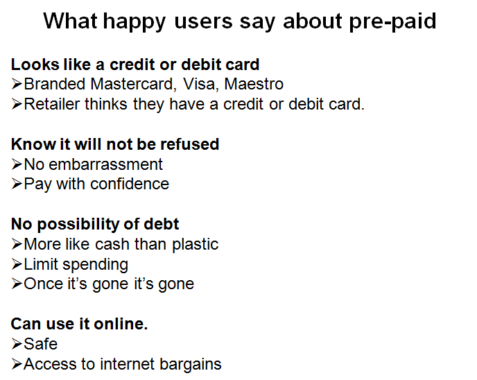 First, they look – and are even branded – like a credit or debit card – MaterCard, Maestro, Visa. Even the merchant fees are the same. So the retailer or hotel or car hire firm thinks they have a credit or debit card.