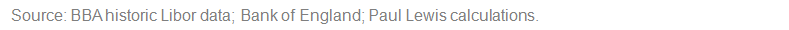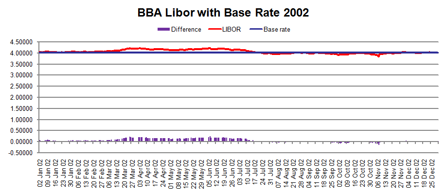 And you can see LIBOR fluctuated by tiny amounts – never more than 23 basis points (ie 23 one hundredths of a percentage point) above and on some occasions a few basis points below but never more than 16. The average over the year was about 6 basis points above base rate – 4.06%. You can see the difference between the two numbers in the purple bar chart at the bottom of the graph.