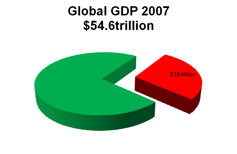 And to put that number in context the GDP of every country on the planet is estimated by the IMF in 2007 to be $54,584,918mn. $15tn is more than a quarter of that. So every human on earth has to work for more than three months just to underwrite the mistakes made by a few bankers who, like Sir Fred, have assured their own wealth while impoverishing others.