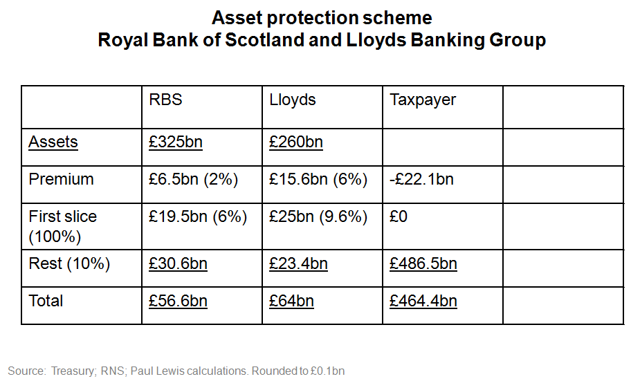 RBS is putting £325bn into the scheme, it pays the government a premium of £6.5bn – 2% of the assets – it bears the first £19.5 billion loss and 10% of the rest so its total possible commitment is £56.6bn – probably about two year’s losses for RBS!
