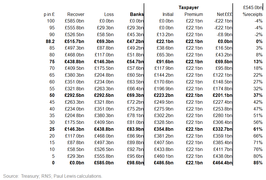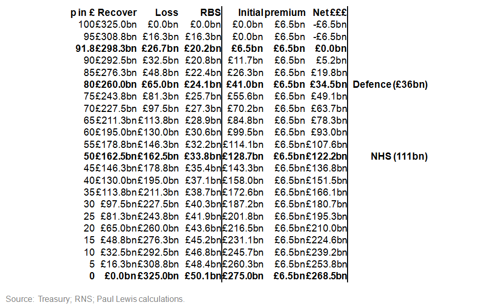 It turns out that RBS assets need to return 91.8p in the pound to break even. If we get 80p in the pound that will cost us as much as the defence budget. And if they fetch 50p in the £ that is the NHS closed down for a year.