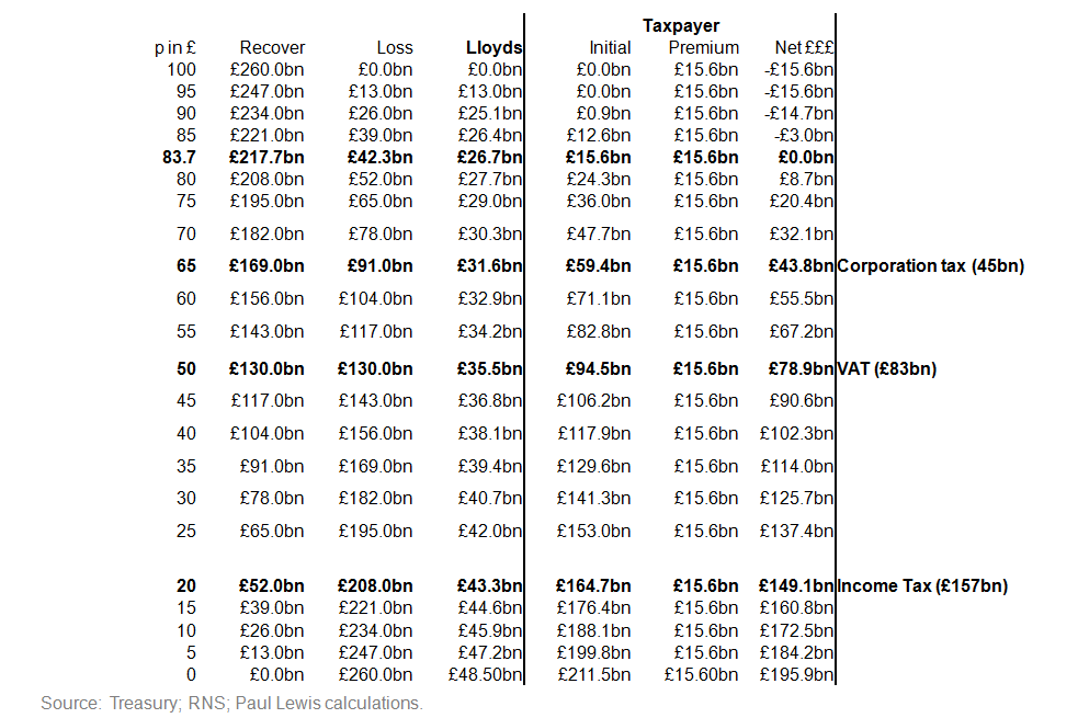 In the case of Lloyds the break even point is 83.7p in the pound. And if Lloyds’ assets fetch 65p in the pound it will cost us the whole take from Corporation taax. At 50p that is the whole VAT take. And 20p that is the same as scrapping income tax for a year.