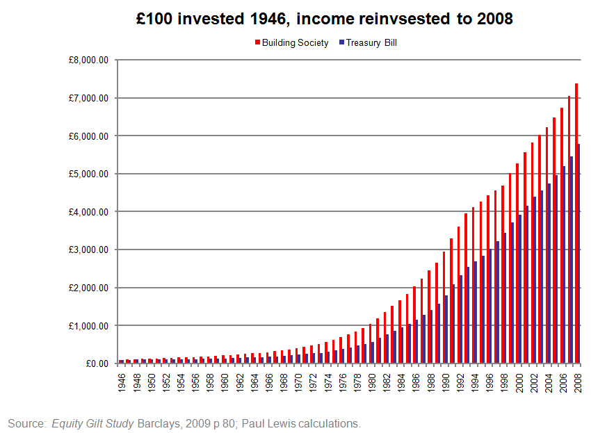 Now I don’t have those figures month by month for comparison here. But if we take the figures from Barclays comparing building societies with T Bills from 1946 the average return on the building society account is higher than the T Bills – compound about 7.07% compared with 6.66%. And over 63 years that gives you a return that is 22% higher.