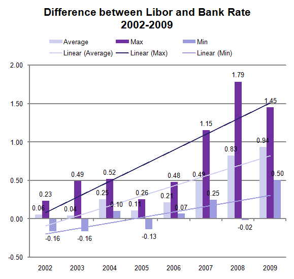 Because Libor is the rate that the banks choose to charge each other it is a much more realistic expression of interest rates and the availability of credit in the real world. But it wasn’t LIBOR that people were interested in – it was the difference between LIBOR and bank rate. That was seen as an important measure of trust between the banks. The bigger the gap the less the trust.