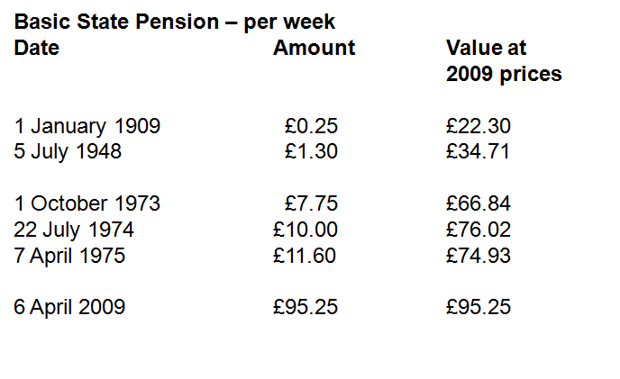 Still not enough to live on but a lot more than when the present system began in 1948 when the state pension was £1-6s or £1.30. In today’s terms that is £34.71. So it had more than doubled in real terms in the quarter of a century since. And indeed in 1948 it was fixed much higher than the very first state pension paid in 1908 when it was 5/= – or 25p a week – and that was worth about £22.30 in today’s terms.