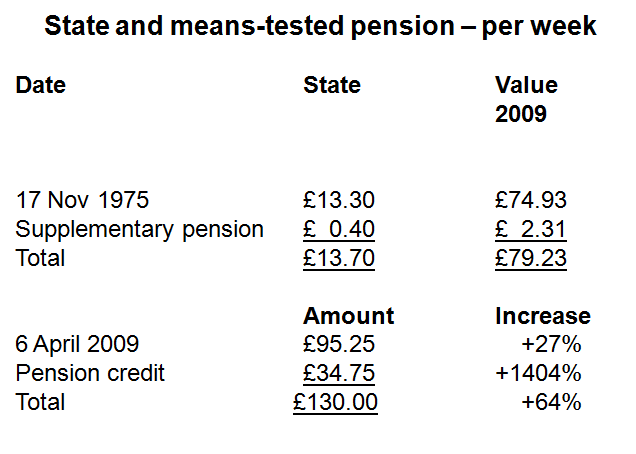 From this week pension credit tops your income up to £130. And you can see the increases in both the state pension and the means-tested top up since 1975 – 34 years.