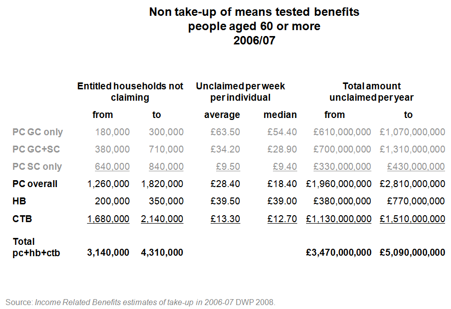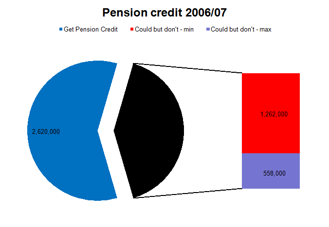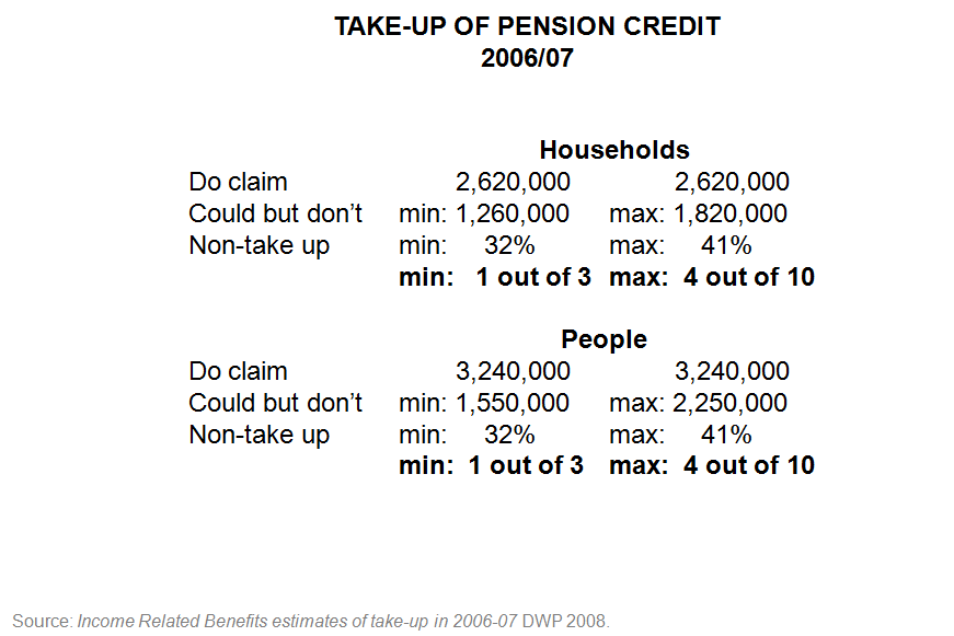 So 2,620,000 households who claim pension credit. And between 1,260,000 and 1,820,000 who do not. That range represents the uncertainty of these calculations. And it is no more meaningful to find the average of those than it is to pick the smaller or the bigger. So what you can say is that a minimum of a third and a maximum of four out of every ten who could claim pension credit do not do so. That is up to 1,820,000 households – which is probably about 2,250,000 people over 60 live on an income which is less than the amount provided for by pension credit. And that is three years into a mature scheme.