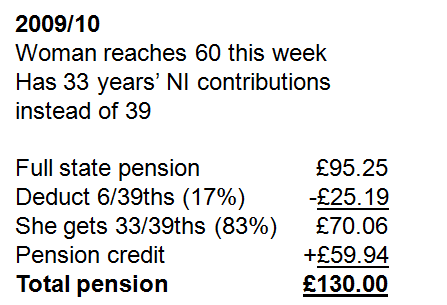 Who gets pension credit? One big group are those who have not paid enough National Insurance contributions to get a full state pension. So there are an army of civil servants working in Newcastle who assess the National Insurance contributions and say ‘mmm you’ve not quite got the 44 years (39 if it’s a woman) to get a full state pension. You are six years short. So we’ll dock your pension down from £95.25 a week down to 83% of that which is £70.06. That’s a loss of £25.19. But then she calls the pension credit helpline and they say you live alone, your pension is £70.06 we’ll add another £25.19 to make it up to £95.25 and another £30.75 to make it up to £130. So it doesn’t matter if she paid all her contributions, 83% of them or none at all she would still get the same income from the state. But there is one army working out what to take away from her. And another army giving it back – and more.
