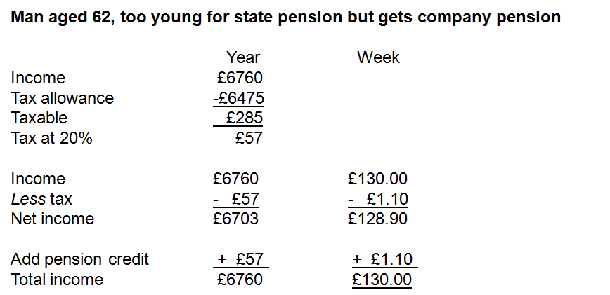 And there is one final idiocy of pension credit. The state pension and works pensions are taxable. Suppose your income from these two is £130 a week and you are under 65. So your tax allowance is £6475. £130 x 52 is £6760. So you get more than your tax allowance by £285 and that is taxed at 20% which is £57 or £1.10 a week. So you give that to the taxman – or woman. You then apply for pension credit. And that looks at your net income after tax which is £128.90. It then gives you £1.10 back in guarantee credit to make your income up to £130 a week. Under 65 you do not get savings credit so that is all the pension credit you get. So one army taxing you by £1.10 a week and another giving you back pension credit worth £1.10 a week.