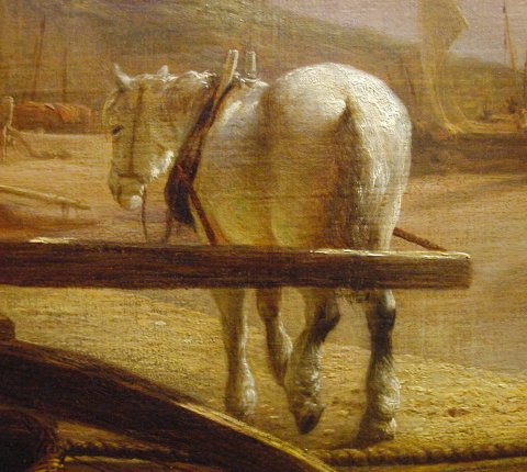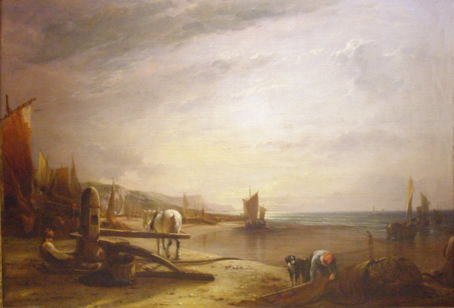 | Capstern at work, drawing up fishing boats oil on canvas 86.5x122.5cm, painted on commission for Sir Thomas Heathcote who paid 150 guineas (£157.50) for it. The picture show a horse driven capstan used to pull fishing boats on to the beach. The painting was on sale at Christies on 30 November 2001 lot 51 but was unsold - estimate £15,000-£20,000. |