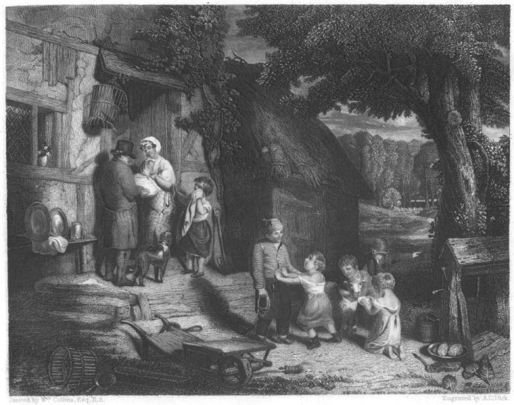 | William Collins painted the Disposal of a Favourite Lamb in 1812, the year of his father's death. It was shown at the Royal Academy Exhibition in 1813 and was bought for 140 guineas by William Ogden. It became one of Collins's more popular works and was engraved and many times, in both the UK and the USA, normally under it's more popular title The Sale of the Pet Lamb. This engraving by A.L.Dick is probably from Pictures and Painters of the English School, W. Cosmo Monkhouse 1880 where the picture was called Selling The Pet Lamb. It was also reproduced by other engravers in Watts's The Literary Souvenir, The Ladies Depository, and in at least one large, freestanding edition engraved by S W Reynolds. It was often accompanied by a poem or story describing what was going on. Wilkie Collins recalls in his father's biography that up to 15,000 impressions of one small engraving of it were sold. |