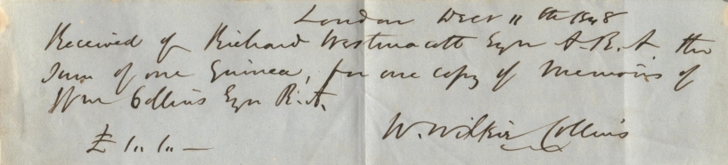 | London Decr 11th 1848 Received of Richard Westmacott Eqr A.R.A. the sum of one Guinea, for one copy of Memoirs of Wm Collins Esqre R.A. W. Wilkie Collins £1"1"--- |
