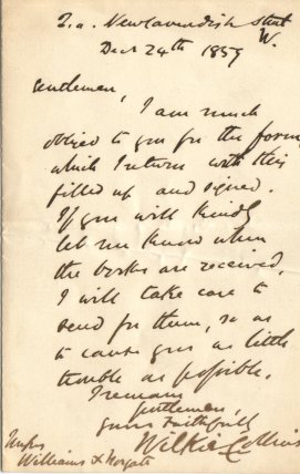 2.a. New Cavendish Street W. Decr 24th 1859 Gentlemen, I am much obliged to you for the form, which I return with this filled up and signed. If you will kindly let me know when the books are received, I will take care to send for them, so as to cause you as little trouble as possible. I remain gentlemen yours faithfully Wilkie Collins Messrs Williams & Norgate |