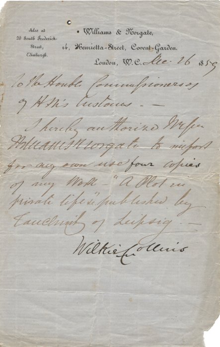 | [embossed heading] Williams & Norgate 14, Henrietta-Street, Covent-garden. London, WC Dec. 26 1859 Also at 20 South Frederick- Street, Edinburgh To the Honble Commissioners of H.M's Customs --- I hereby authorize Messrs Williams & Norgate to import for my own use {four} cop{ies} of my Work -- "A Plot in private life" as published by Tauchnitz of Leipzig. -- {Wilkie Collins}
