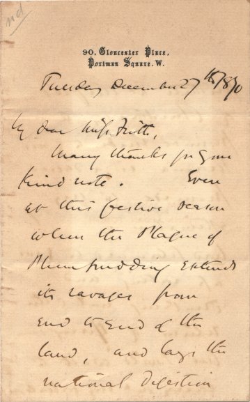 [90 Gloucester Place Portman Square. W.] Tuesday December 27th 1870 My dear Miss Frith Many thanks for your kind note. Even at this festive season when the Plague of Plum pudding extends its ravages from end to end of the land, and lays the national digestion |