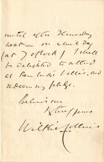 | until after Thursday next - on which day (at 7 o'clock) I shall be delighted to attend Pembridge Villas, and redeem my pledge. Believe me Vy truly yours Wilkie Collins |