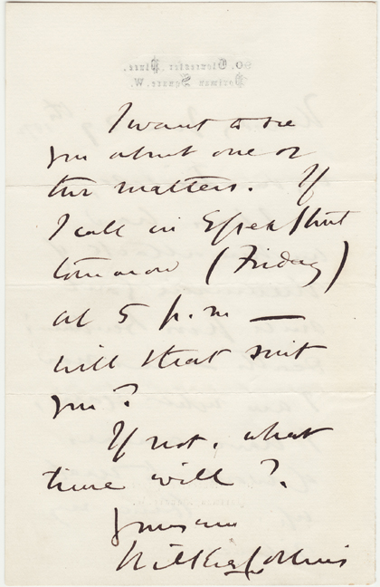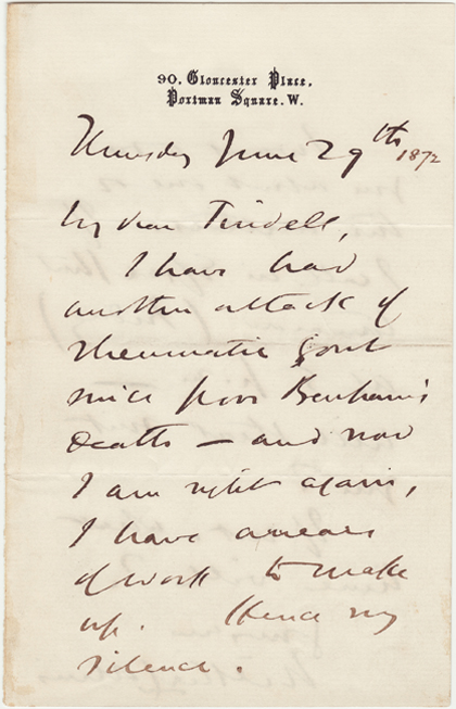 The year 1872 in the date is inserted in another hand and is wrong. The date of the letter is 1871. Edward Benham, Tindell's partner, died at his home of smallpos and fever on 30 April 1871 at the age of 48. And 29 June was a Thursday in 1871 but not 1872. Essex Street is the address of Tindell's office.