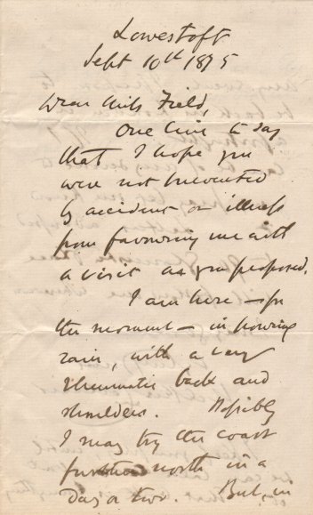 Lowestoft September 10th 1875 Dear Miss Field One line to say that I hope you were not prevented by accident or illness from favouring me with a visit as you proposed. I am here - for the moment - in pouring rain, with a very rheumatic back and shoulders. Possibly I may try the coast further north in a day or two. But, in |