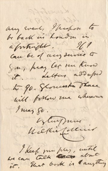 | any event, I propose to be back in London in a fortnight. If I can be of any service to you, pray let me know it. Letters addressed to 90. Gloucester Place will follow me wherever I may go. Vy truly yours Wilkie Collins I keep your play, until we can talk [del: illegible] about it. That book is [deleted character] anything |