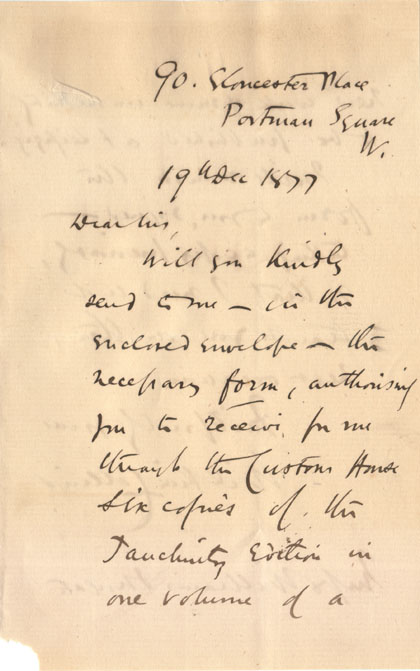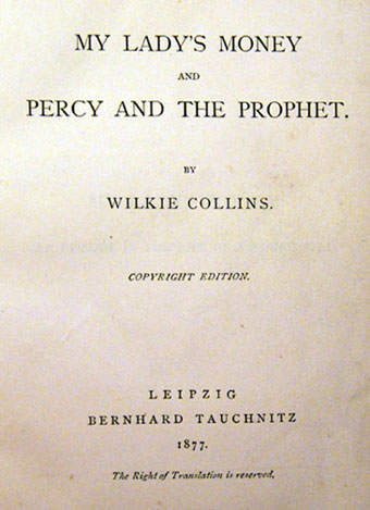 The book was My Lady’s Money and Percy and the Prophet published by Tauchnitz on 3 January 1878. Copies are recorded from December 1877 (Todd & Bowden No.1706). |