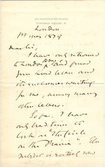 [90, GLOUCESTER PLACE. PORTMAN SQUARE. W.] London 1st May 1879 Dear sir, I have only returned to London /today/ and found your kind letter and its enclosures waiting for me, among many other letters. So far, I have only had time to look at "The Circle on the Prairie". The subject is entirely new |