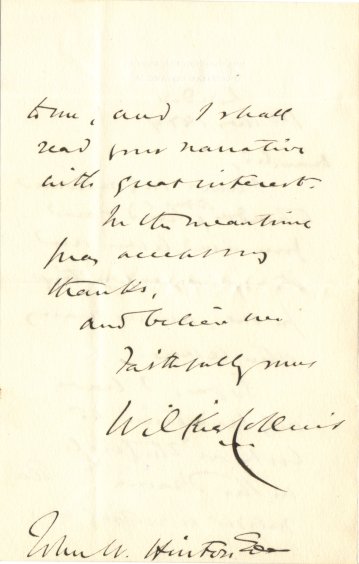 to me, and I shall read your narrative with great interest. In the meantime, pray accept my thanks and believe me Faithfully yours Wilkie Collins John W Hinton Esq |