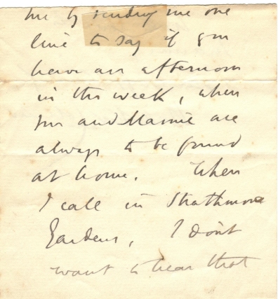 me by sending me one line to say if you have an afternoon in the week, when you and Mamie are always to be found at home. When I call in Strathmore Gardens, I don’t want to hear that [text missing] |