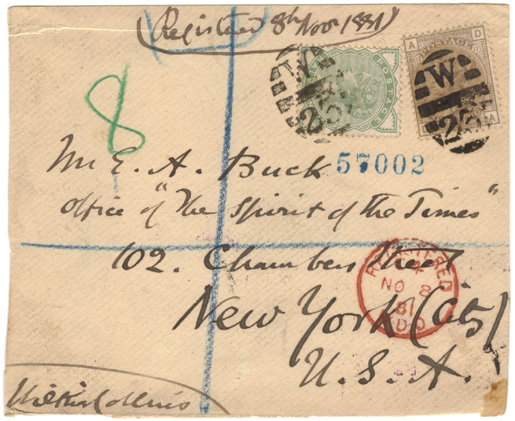 Mr E. A. Buck Office of "The Spirit of the Times" 102. Chambers Street New York (City) U.S.A. Wilkie Collins |