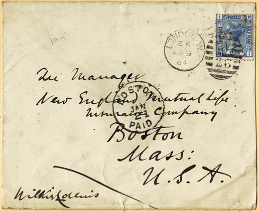 The insurance policy for $5000 (£1000) was one of two Wilkie took out before he sailed from the USA to England in March 1874. Similar letters of 1885 and 1887 are known.