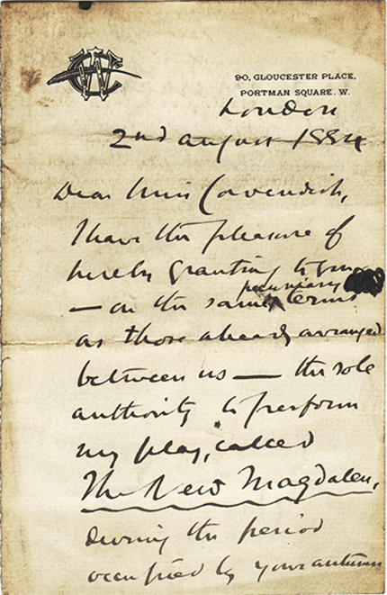 Ada Cavendish (1839-1895) was an actress and theatre manager who produced the play when it was first performed in 1873 at the Olympic Theatre playing Mercy Merrick opposite Frank Archer as Julian Gray. She revived it a decade later and toured The New Magdalen in many provincial towns in 1883 and 1884. On 23 June 1883 Collins he wrote to Ada Cavendish to specify that she should pay £3 for each representation. Earlier on 9 June 1883 he thanked her for £50 'in part payment of the author's fees for the right of performing "The New Magdalen" in the provinces -- during your previous tours.' She later revived it in London at the Novelty in January 1884.