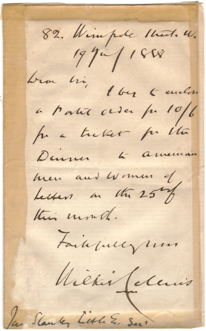 82. Wimpole Street, W. 19 July 1888 Dear sir, a Postal Order for 10/6 for a ticket for the Dinner to American Men and Women of Letters on the 25th of this month.