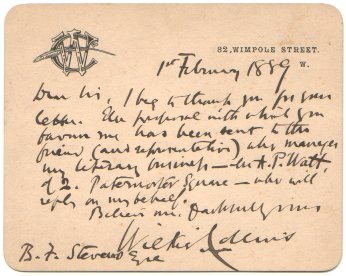 Alexander Pollock Watt (1834-1914) was Wilkie's literary agent from December 1881 when he invited him to negotiate the rights to Heart and Science, to his death. Wilkie wrote to Watt on the same day as this card 'Here is another American proposal. I have told Mr Stevens that his letter has been sent to you. Does "prior publication in the United States" mean that I am to sell my English copyright -- or rather sacrifice my English copyright? I shall be curious to know what sum they would offer me for such an act of resignation as this!' The Public Face of Wilkie Collins IV 357-358.