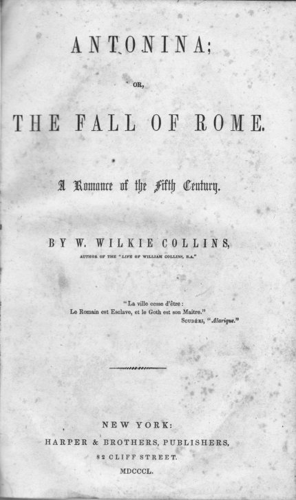 Title page of first US edition of Antonina published by Harper & Brothers in 1850. This rare item is the first US publication of a book by Wilkie and is thought to be the first of any of his writing in the States. Harper paid $15 for early proofs and this represents the start of a long relationship with Harper. The book was republished by them in 1874 in their Illustrated edition of Wilkie's works. |