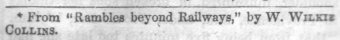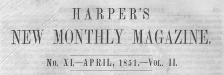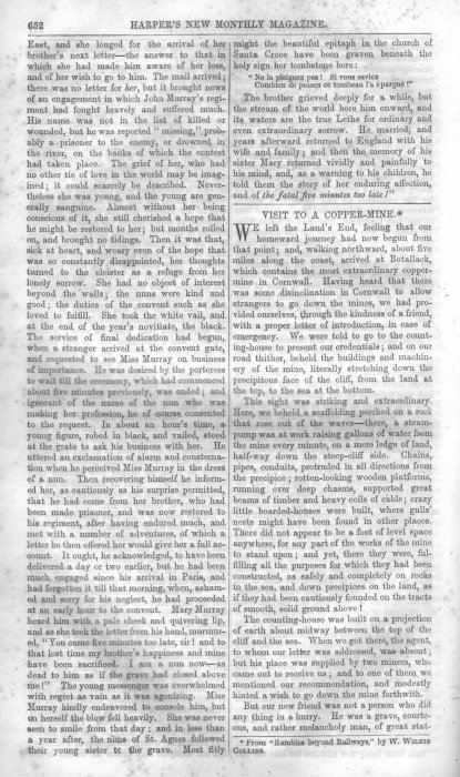 Two extracts from Rambles were published in Harper's New Monthly Magazine in April 1851. 'The Pilchard Fishery on the Coast of Cornwall' pp630-633 was an edited version extract of chapter VIII 'The Pilchard Fishery' and 'Visit to a Copper Mine' pp652-656 was an edited version of chapter XI 'Botallack Mine'. Both were credited to Wilkie in a footnote. Harper had published his previous book Antonina in the US. |